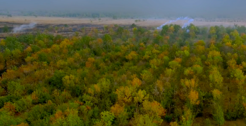Загоряння в лісосмузі, яку російські новобранці використовували як воєнний полігон, вересень 2023 р., скріншот з репортажу пропагандистів