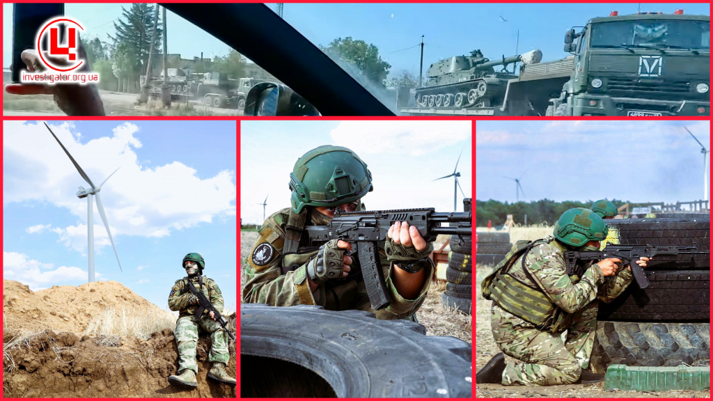 Тренування окупантів посеред вітряків Ботіївської ВЕС біля с.Приморський Посад, серпень 2023 р., скріншоти з репортажу пропагандистів, колаж investigator.org.ua