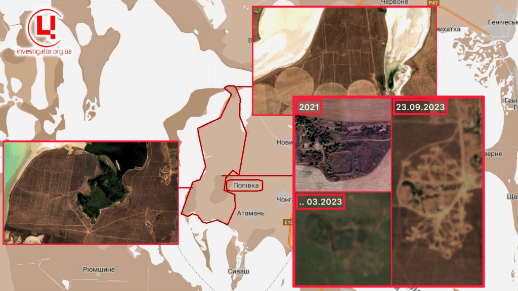 Вочевидь, і цього окупантам замало. На протилежному кінці півострова військові РФ розгорнули ще один полігон на площі понад 4 000 га. Знаходиться він поблизу с.Попівка, поряд з яким з березня по липень 2023 ворог збудував базу. На знімках видно об’єкти, які можуть слугувати укриттями для техніки, або ж майданчиками для гелікоптерів. Є ознаки того, що це будівництво продовжується.