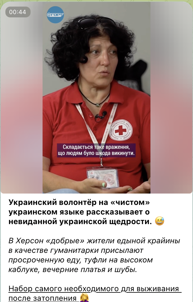 Цього разу вони взяли шматок інтерв'ю з представницею Червоного Хреста України в Херсоні Наталею Шатіловою, яке ми опублікували в Телеграм. У ньому Наталя розповідає, що до Херсона після підтоплення серед корисних речей надсилали й недоречну гуманітарну допомогу – туфлі на підборах, вечірні сукні, шуби та дитяче харчування, строк зберігання якого збігав. На відміну від пропагандистів ми не замовчуємо проблеми, а говоримо про негаразди, якщо вони є.