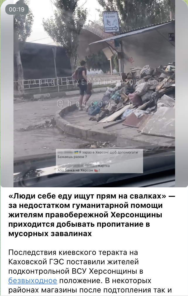 Для підтвердження цього дикунського меседжу пропагандисти опублікували відео. На ньому людина копирсалась у купі сміття та врешті нічого з неї не взяла. Це сміття колись було майном людей, які постраждали внаслідок підриву росіянами Каховської ГЕС. Далі, намагаючись довести, що в Херсоні немає їжі, пропагандисти опублікували відео закритого магазину Фреш у мікрорайоні “Острів”. Це чергова цинічна маніпуляція. Щодо гуманітарної допомоги в Херсоні ми розповідали вище, а мікрорайон Острів російська армія постійно обстрілює. Після підриву Каховської ГЕС він повністю пішов під воду. Проте в інших районах міста Херсон працюють ринки, магазини, місцеві та всеукраїнські мережі – це знають ті, хто там живе.