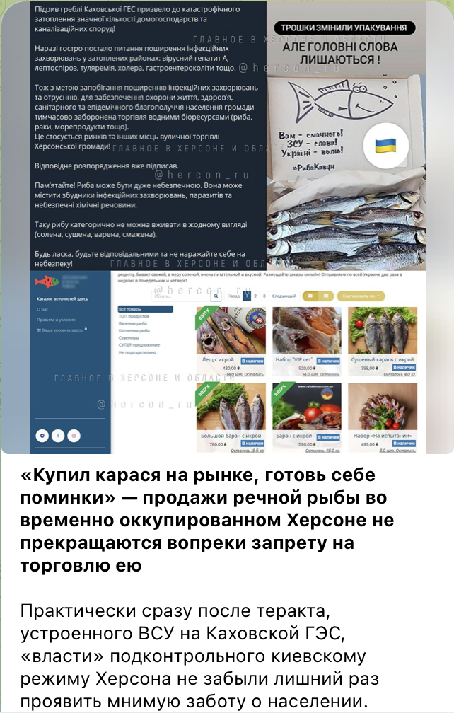 Російські пропагандисти пильно стежать за повідомленнями від української влади та знають, що торгівля рибою та іншими водними біоресурсами тимчасово заборонена після того, як росіяни підірвали греблю Каховської ГЕС. Саме про це заявив 20 червня Роман Мрочко, начальник Херсонської міської військової адміністрації.