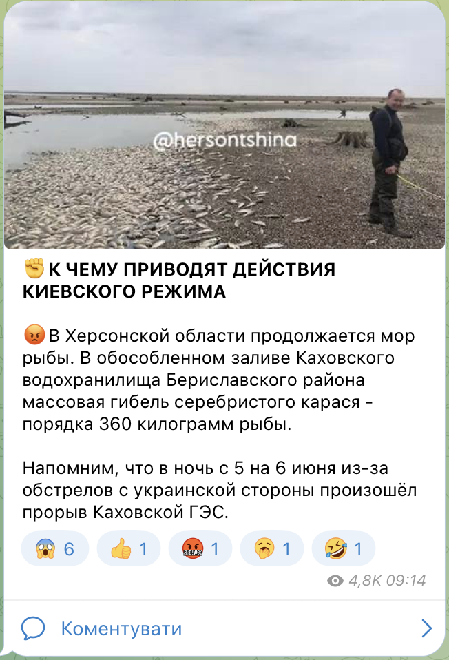 Проте пропагандисти взяли це фото у Запорізького рибоохоронного патруля, який досліджував ситуацію в заплавній частині Каховського водосховища у межах Запорізького району. Державне агентство меліорації та рибного господарства у Запорізькій області, УСБУ в Запорізькій області та Державна екологічна інспекція Південного округу (Запорізька та Херсонська обл.) виявили факт загибелі 9 тисяч особин карася сріблястого, 4 сазанів та 1 судака. Отримані матеріали долучено до кримінального провадження. Риба загинула через те, що знизився рівень води в акваторії Каховського водосховища після підриву росіянами ГЕС.