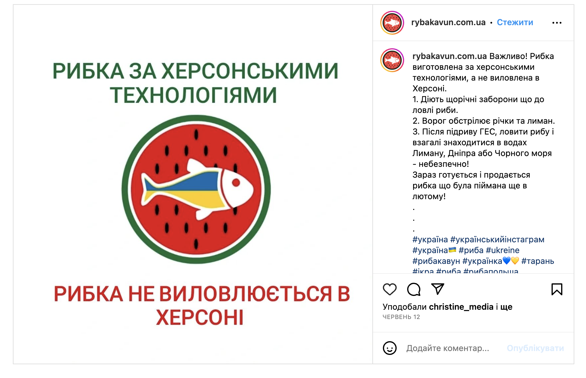 Проте у липні пропагандисти вирішили розповсюдити фейк – нібито херсонська риба продається всупереч забороні. Для цього вони використали акаунт та сайт “Рибикавун”, які ще 12 червня повідомили: риба, яку вони продають, була виловлена раніше.