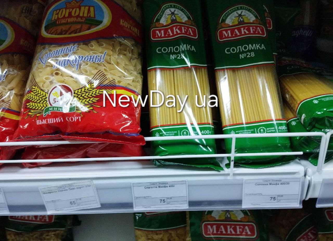 Кілограм рафінованого цукру з Кубані продають по 126, солі з Оренбурзької області – 27-34, півкіло кримської соди – 41 рубль.900-грамова пачка макаронів коштує 65-69 рублів. Є дорожчі, зроблені «під Італію» – 122 рублі за 450 грамів. 400 грамів спагеті, яке у росіян називається «соломкою», вартує 75 рублів.