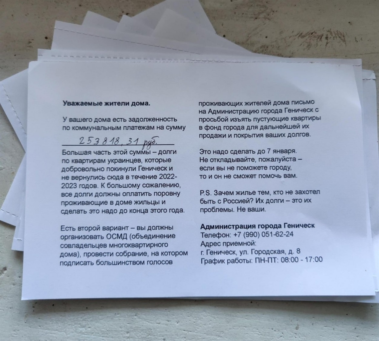 В окупованому Генічеську на Херсонщині колаборанти придумали нову схему віджиму житла у власників. Про її нюанси і становище місцевих жителів розповідає кореспондент NovaKahovka.City.“Зачем жилье тем, кто не захотел быть с Россией?»Схема, яку впроваджують колаборанти, проста. Спочатку на багатоквартирний будинок “навішують” борги по комуналці. Потім примушують сплатити ці борги тим мешканцям, які залишилися.
