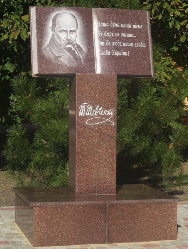 День державного прапора Росії на окупованому лівобережжі Херсонської області окупанти і колаборанти відзначили з розмахом. Піснями, танцями, автопробігами. А ще радісними фотографіями з заходів. На одній з них бачимо голову окупаційної адміністрації Нижньосірогозького «муніципального округу» Владислава Нікітенка з дівчинкою на фоні пам’ятника Т.Г. Шевченку.Та що це за дивний чотирикутник поряд з портретом Кобзаря?Якщо захочемо побачити, яким був пам’ятник нашому великому поету на центральній площі Нижніх Сірогоз біля ЦКД, на книжці з червоного граніту зможемо прочитати рядки з поезії «До Основ’яненка»: «Наша дума, наша пісня / Не вмре, не загине.