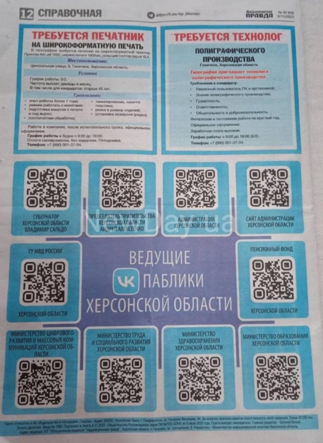 У вихідних даних так само зазначено, що надруковано її у видавництві «Таврида» у тимчасово окупованому Сімферополі. Але звертають на себе увагу два великих оголошення на останній шпальті «Потрібен друкар на широкоформатний друк» і «Потрібен технолог поліграфічного виробництва». Кандидатам пропонують високу зарплату, зручний графік. Працювати, пишуть, треба буде у Генічеську. Скоріше за все, окупаційну агітку хочуть видавати на місці, бо друк у Криму став або не по кишені, або там відмовили з інших причин, або друкувати будуть щось інше...