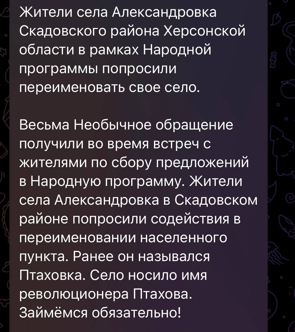 Вельми незвичне звернення отримали під час зустрічей із жителями зі збору пропозицій у народну програму. Жителі села Олександрівка в Скадовському районі попросили сприяння у перейменуванні населеного пункту. Раніше він називався Птахівка. Село носило ім’я революціонера Птахова. Займемося обов’язково!» – повідомили окупанти.