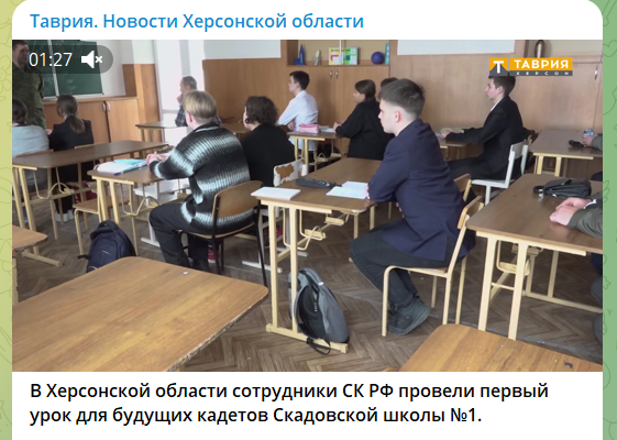 Скадовськими кадетам, судячи з усього, опікуються представники російського “Слідчого комітету”, що має власний кадетський корпус. Саме російські слідчі влаштовують для скадовських школярів різноманітні заходи, під час яких переконують їх пов’язати майбутнє з силовими структурами окупантів.