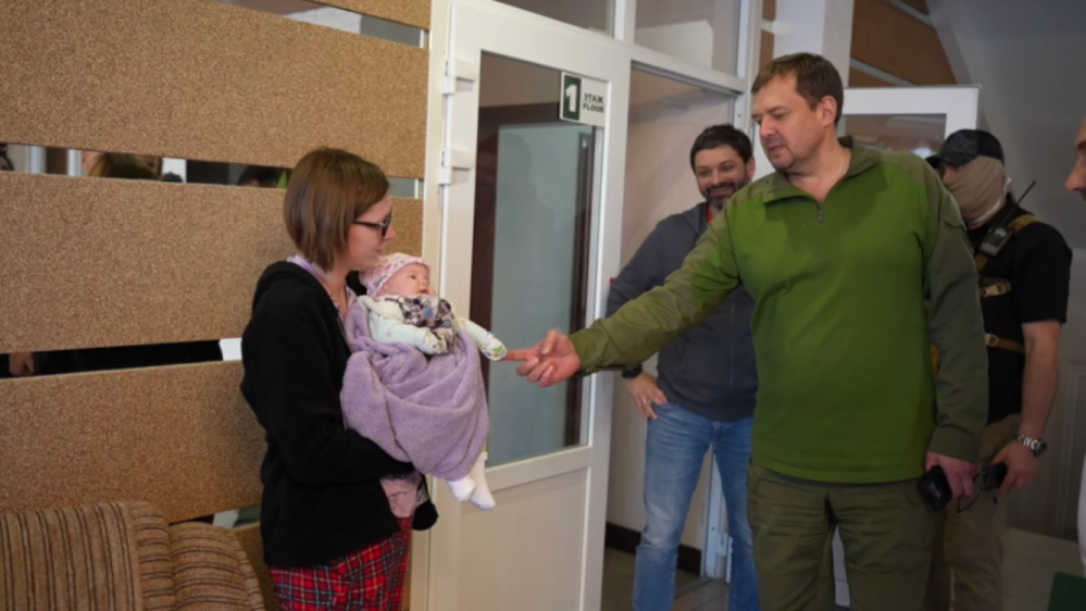 Гауляйтер Євген Балицький спілкується з «переміщеною» мешканкою ТОТ у Бердянську, 07.05.2023 р. Фото: скріншот відено окупаційного тг-каналу.