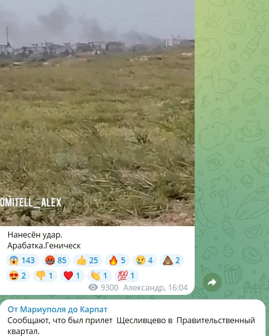 Зокрема, телеграм-канал Генічеськ.ua з посиланням на інформацію від місцевих жителів уточнює, що «прильоти» були по пансіонату «Експрес» де розмістилась Росгвардія.