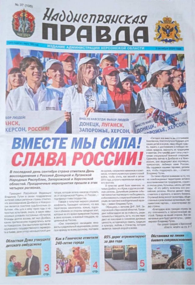 Перші сторінки того, що окупанти називають «газетами», пропагандисти постійно віддають від висловлювання зовсім не мудрого Путіна. В двох останніх номерах окупаційної агітки «Комсомольская правда. Херсонская область», він, наприклад, хвалить жителів окупованих регіонів за «велику любов до Вітчизни», а вчителів-колаборантів - за «виняткову вірність професійному обов’язку».На першій шпальті окупаційної «газети» «Надднепрянская правда» брехні від російського диктатора більше.