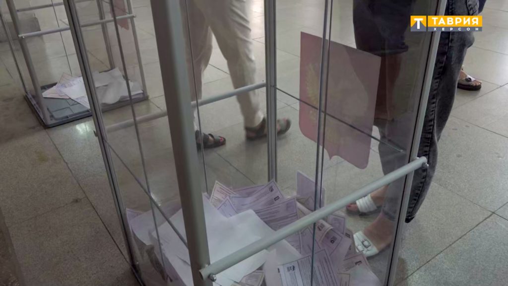 Але навіть в сюжеті прокремлівського медіа можна побачити, що на виборчій дільниці дуже небагато людей і відповідно – дуже небагато бюлетенів в скриньках для голосування.