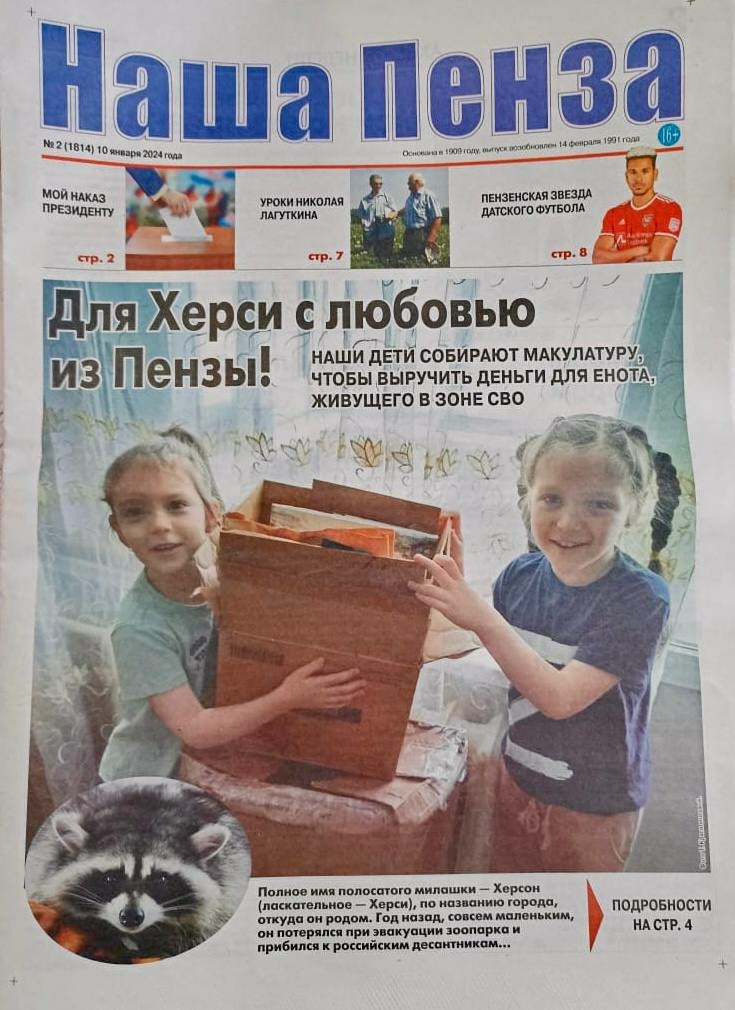 Заголовки пензенських газет.Подія потрапила до місцевої преси, а російські журналісти додатково придумали щемливу історію про те, що єнот загубився під час “евакуації” з Херсона і його підібрали російські військові. Наспрвді ж тварина була викрадена з одного із херсонських зоокуточків директором кримського зоопарку Олегом Зубковим, про що свідчить безліч фото- та відеофактів. Звичайно, ні до якого єнота зібрані кошти не дійдуть, а будуть витрачені на продовження війни та вбивства українців.