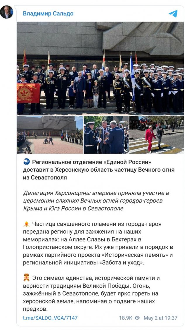 Крім того, повідомлялось, що представники «Єдиної Росії» доставили на лівобережну Херсонщину частинку «вічного вогню» із окупованого Севастополя. Володимир Сальдо назвав цей захід «церемонією злиття вічних вогнів міст-героїв».