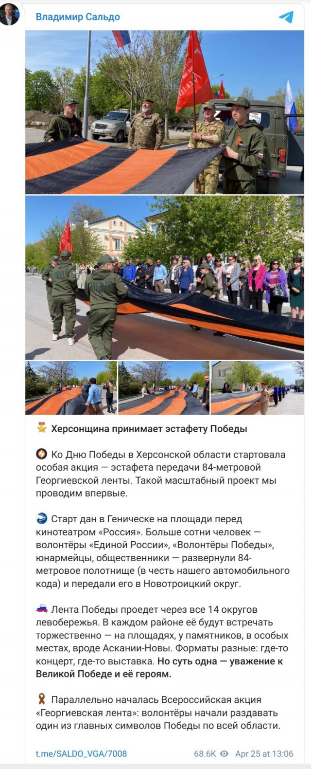 У кінці квітня на окупованій території Херсонщини стартувала естафета передачі «георгіївської стрічки» (забороненої в Україні – ред.) довжиною 84 метри. Її розгорнули в Генічеську і передали до Новотроїцької громади. Місцеві ЗМІ повідомили, що в акції взяли участь нібито понад сто людей, серед яких – волонтери «Єдиної Росії», так звані «волонтери перемоги», учасники руху «Юнармія» та інші.