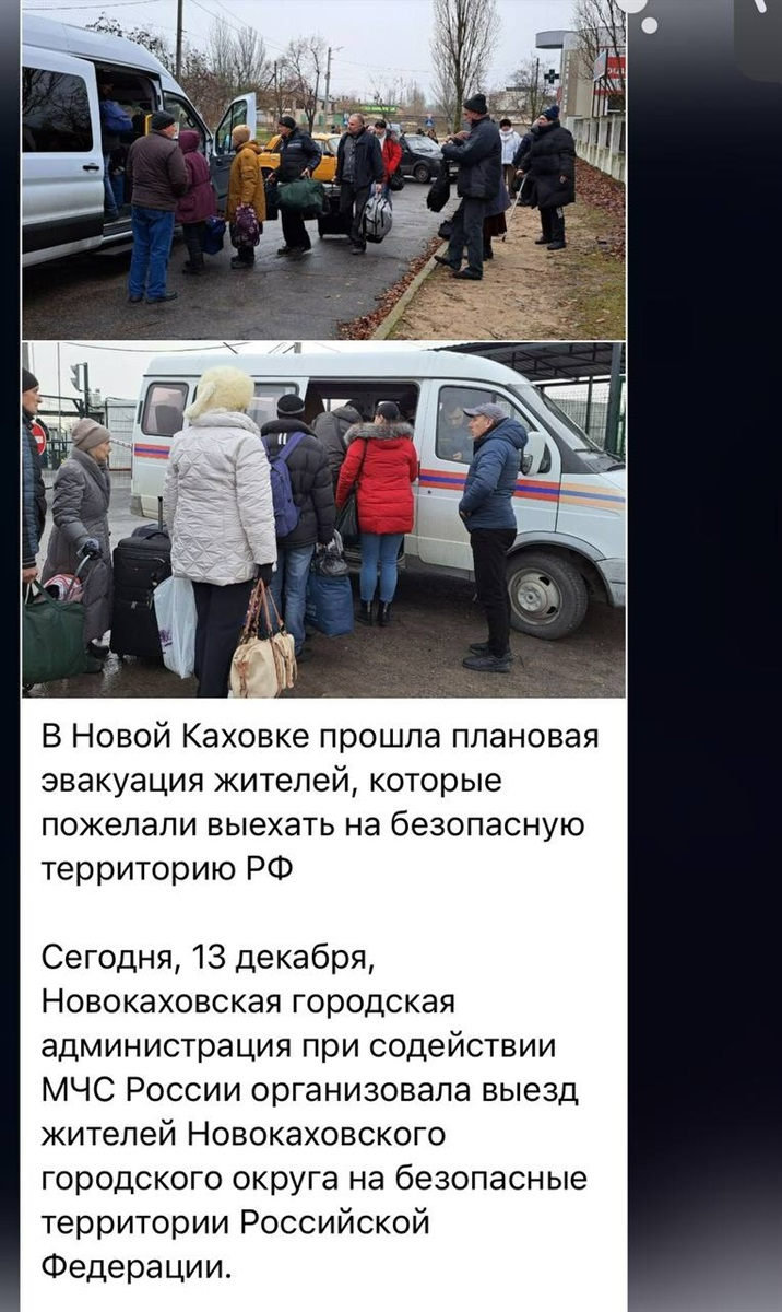 Учора, 13 грудня, в окупованій Новій Каховці на Херсонщині окупанти проводили так звану “добровільну евакуацію" бажаючих виїхати до РФ. Про те, як минула акція, розповідає кореспондент NovaKahovka.City.Що відбулося?На “евакуацію” зголосилося менше 20 осіб. Їх довезли до адмінкордону з Кримом, там пересадили в "Газель" МНС РФ і далі на залізничний вокзал Джанкою.