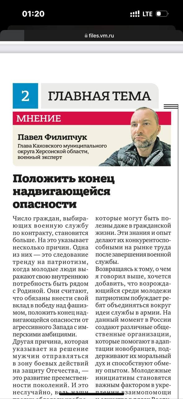 «Коли журналісти телефонують по 4-5 разів на тиждень, взаємодія з пишучою братією стає буденністю», – набиває собі ціну у своєму телеграм-каналі «голова» Каховського «муніципального округу» Павло Філіпчук. Ось і про інтерв’ю пропагандистській «Вечерней Москве» він, буцімто, забув. Добре, пише, що «столичні друзі» нагадали, приславши скрін його «статті».