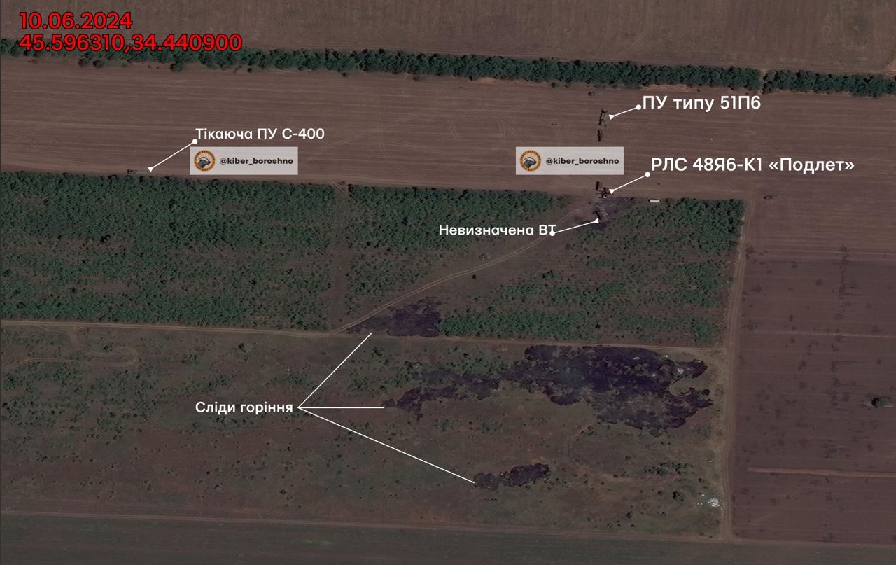 Супутниковий знімок результатів ракетної атаки ЗСУ по позиції російської ЗРК С-400 «Триумф» в районі с. Рубинівка, Джанкойський район, Крим. 12.06.2024 Фото: t.me/kiber_boroshnoЗараз триває протистояння між нашими операторами ракетних систем та російськими операторами систем ППО. Щоб максимально посилити свої бойові можливості, вони тягнуть додаткові системи ППО в район Євпаторії, наприклад, з району мису Фіолент. Так само ворог активно використовує мережу траси «Таврида», переміщуючи з Керчі в бік Севастополя, Сімферополя, Євпаторії додаткові елементи тих самих системи С-300 та С-400.