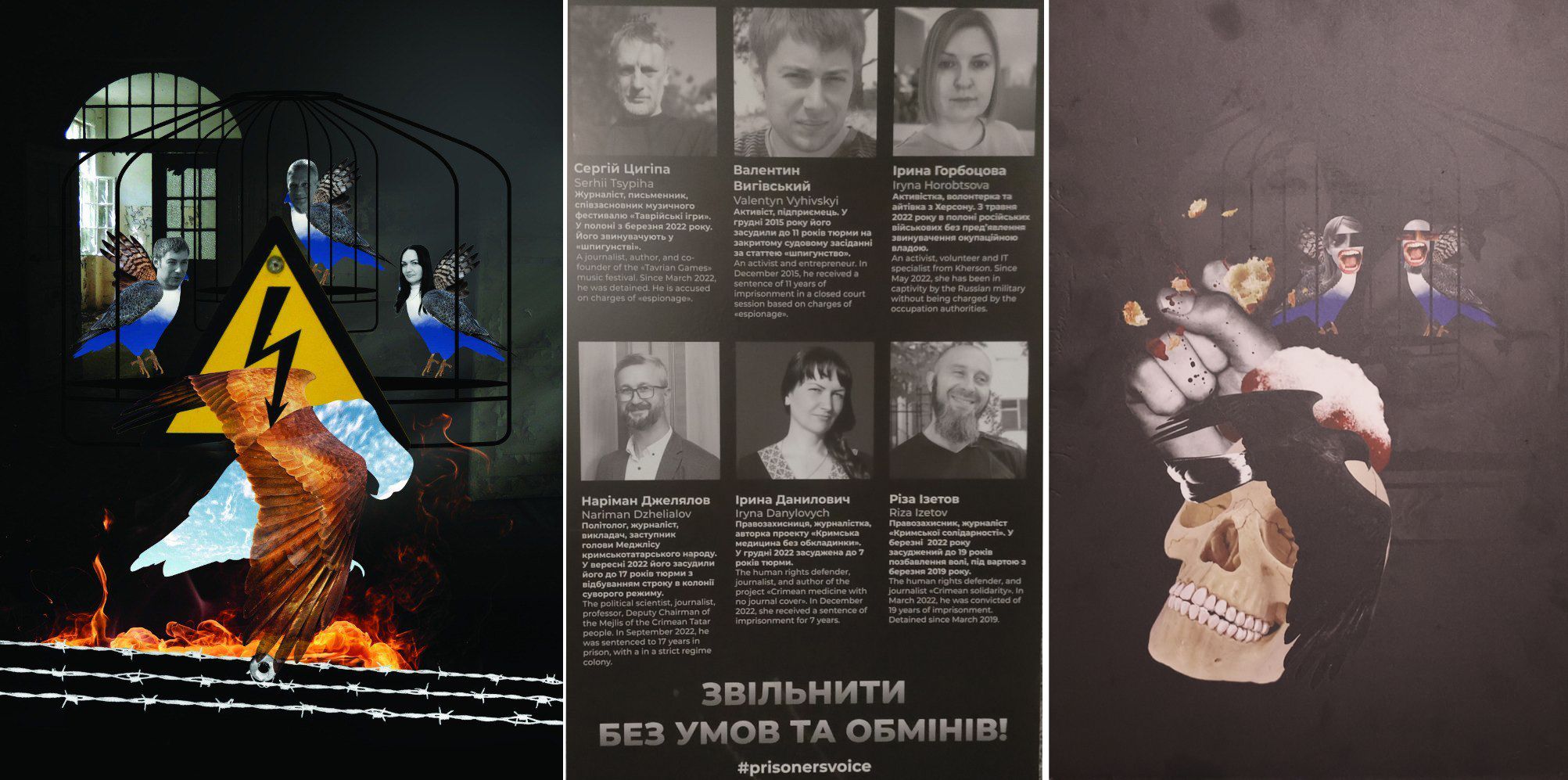 Долі шістьох із них присвячений арт-проєкт Центру громадянських свобод «Будь ласка, звільніть пташок», який з 22 січня по 5 лютого презентований в Одеському історико-краєзнавчому музеї. Це бранці Кремля Валентин Вигівський, Ірина Данилович, Сергій Цигіпа, Наріман Джелялов, Різа Ізетов та Ірина Горобцова – декотрі з них перебувають у неволі з початку 2022 року, а деякі ще з 2014-го. Всі вони були лідерами, до них прислухалися, вони або вели проукраїнські блоги, або займалися волонтерською діяльністю.