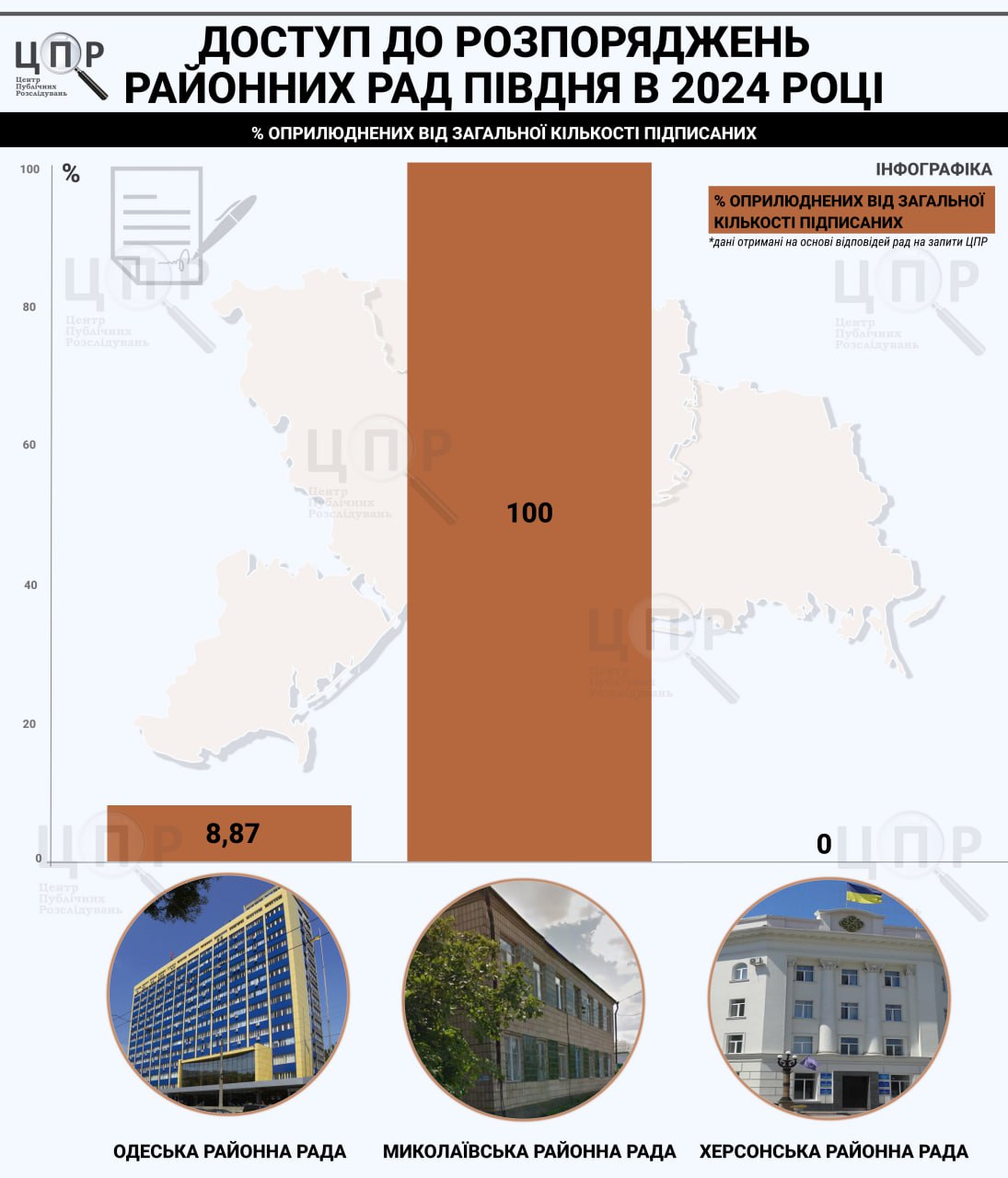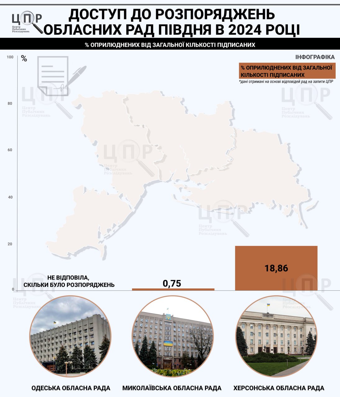 Одним з важливих елементів принципу підзвітності влади на місцях є оприлюднення розпорядчих документів очільників органів місцевого самоврядування (ОМС). Однак не всі ОМС дотримуються цього принципу. Наприклад, свого часу Одеська обласна рада публікувала лише 50% розпоряджень голови ради Григорія Діденка.Аби дізнатись, як на Півдні дотримуються цієї норми, Центр публічних розслідувань надіслав запити до Одеської, Миколаївської та Херсонської міських, районних та обласних рад щодо висвітлення розпоряджень їх очільників в 2024 році.