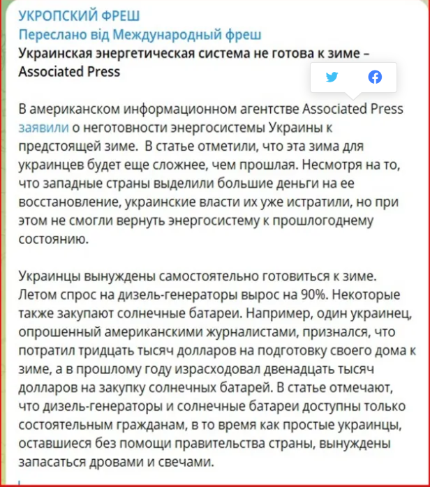Як бачимо, у реальній статті, так йде мова про дрова і свічки, але немає апокаліптичного меседжу. Але є ключовий момент, про який пропаганда промовчала. Чому саме зима буде важкою? Бо росія знову збирається завдавати ракетних ударів по енергосистемі України. Це пропагандисти не озвучили ні у своєму заголовку, ні словом не обмовилися по ходу свого допису. А саме цей меседж пронизує реальну статтю (а не її перекручене переказування) у виданні The Associated Press.