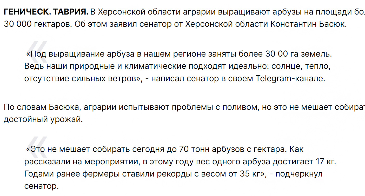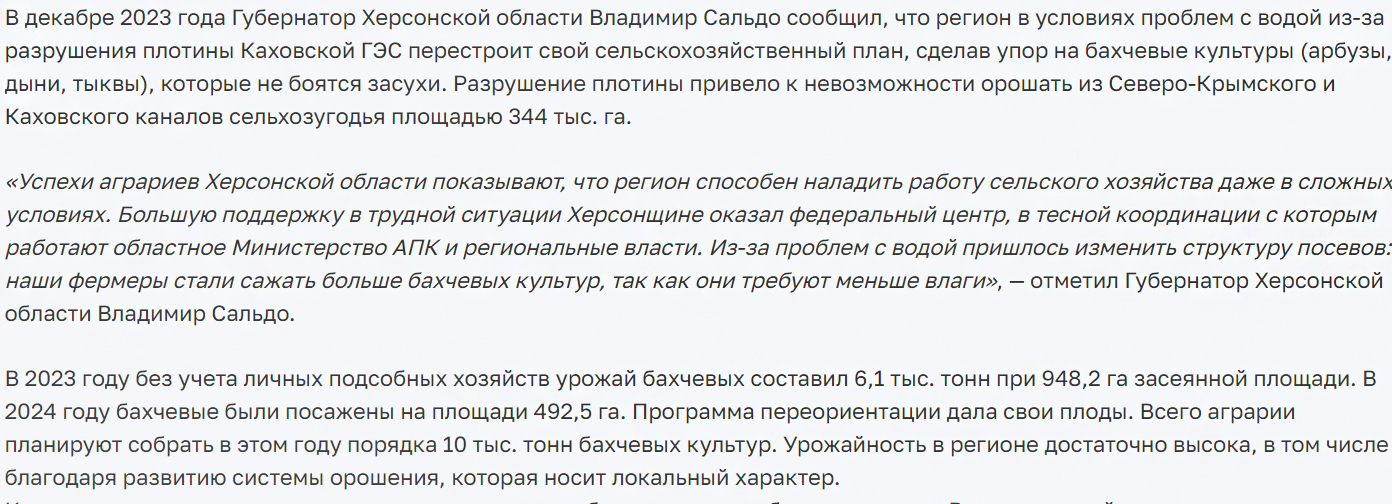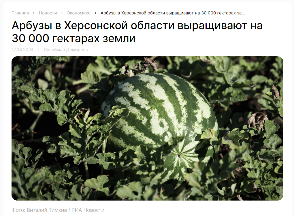 У публікації на сайті окупаційного керівництва Херсонської області за 5 липня 2024 року повідомляється, що торік урожай баштанних культур, без урахування особистих підсобних господарств, склав 6,1 тис. тонн на 948,2 га засіяної площі. У 2024 році баштанні були посаджені на площі 492,5 га. І з цих посівів, за словами Володимира Сальда, планували цьогоріч зібрати близько 10 тис. тонн баштанних культур. Мовляв, урожайність у регіоні досить висока, зокрема, завдяки розвитку системи зрошення, яка має локальний характер.