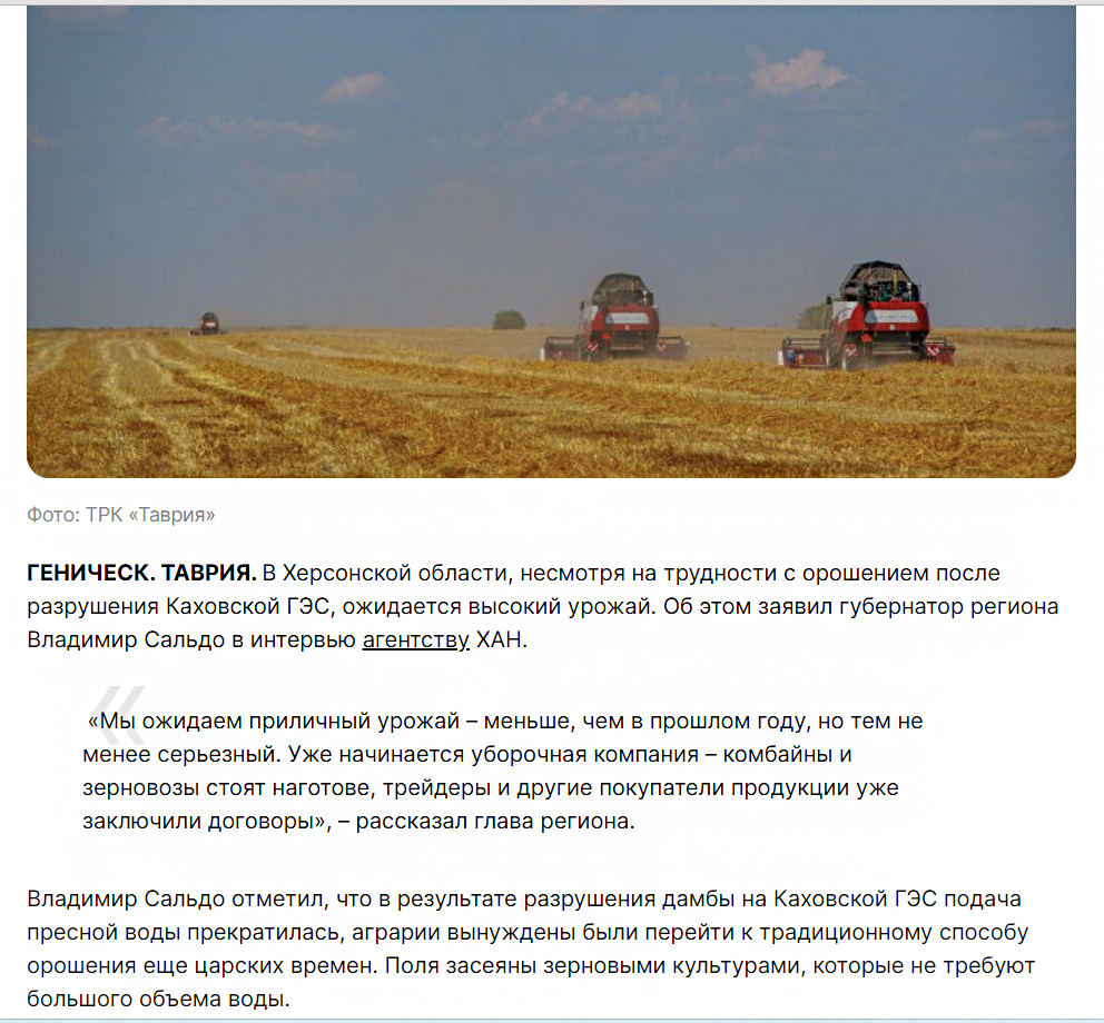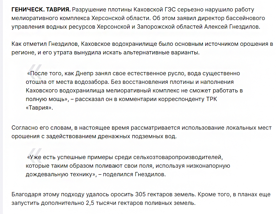 Адже ще 13 червня в інтерв’ю окупаційному каналу “Таврія” він казав, що внаслідок руйнування дамби на Каховській ГЕС надходження прісної води припинилося, і аграрії змушені були перейти до традиційного для дореволюційних часів способу зрошення.