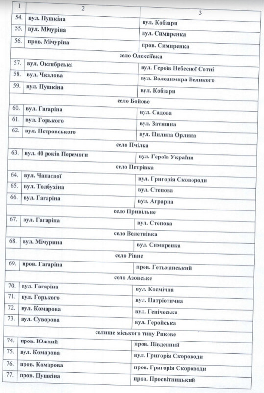 А у Пчілці, Привільному, Велетнівці, Рівному, Москаленка, Виноградному Клині, Чернігівці, Червоному і Семихатці перейменували по 1 вулиці.