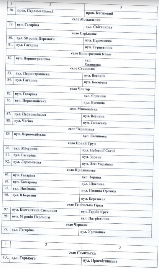 У Стрілковому, Стокопанях, Чонгарі, Миколаївці та Генічеській Гірці перейменували по 2 вулиці.
