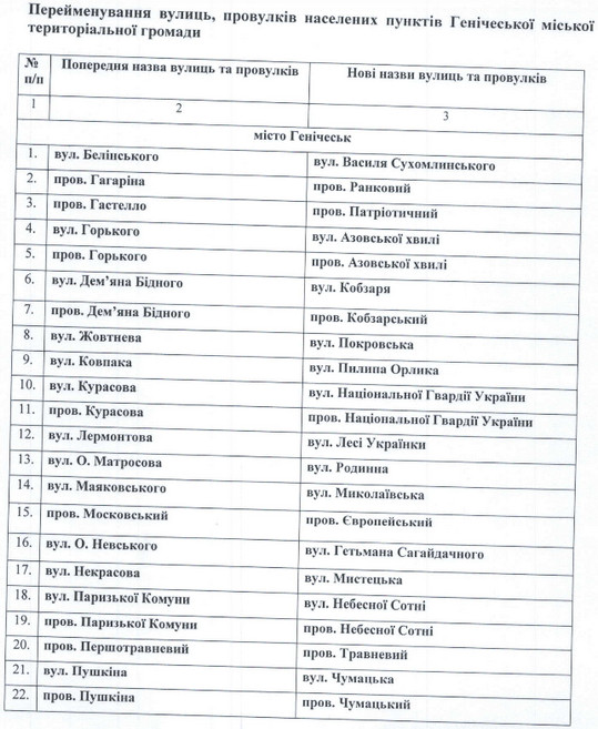 Військова адміністрація Генічеської громади Херсонської області перейменувала сотню вулиць і провулків у своїх населених пунктах.Про це повідомляється на сайті адміністрації.У Генічеську перейменували 33 вулиці та провулки.У тимчасово окупованому Росією місті з’явились вулиця та провулок Азовської хвилі, вул. і пров. Рибацький, вулиця Азовське шосе і т. д.У Новоолексіївці перейменували 16 вулиць і провулків.