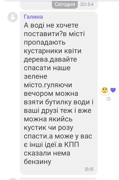 За словами Галини, комунальні служби не поливають зелені насадження через дефіцит палива в місті.