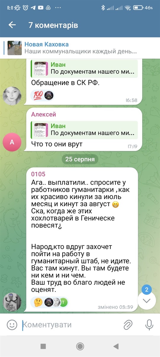 “Так, виплатили… Спитайте у працівників гуманітарки, як їх гарно кинули за липень і як кинуть за серпень, — зазначав інший і додавав: — Народ, якщо хтось захоче працювати в гуманітарному штабі, не йдіть. Вас там кинуть”.