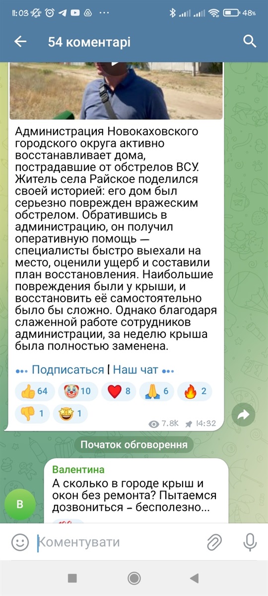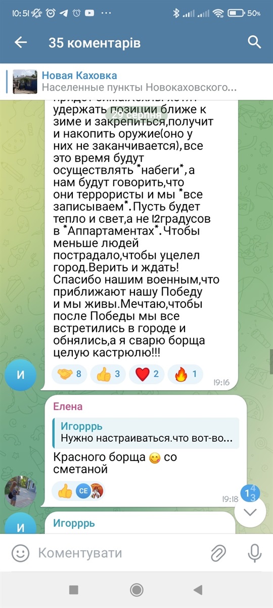 Попри окупацію тривалістю майже три роки, переслідування та катівні, новокаховці продовжують ділитися своєю проукраїнською позицією. Так, навіть у коментарях проросійського каналу люди мріють про перемогу, мирне життя і борщ зі сметаною.