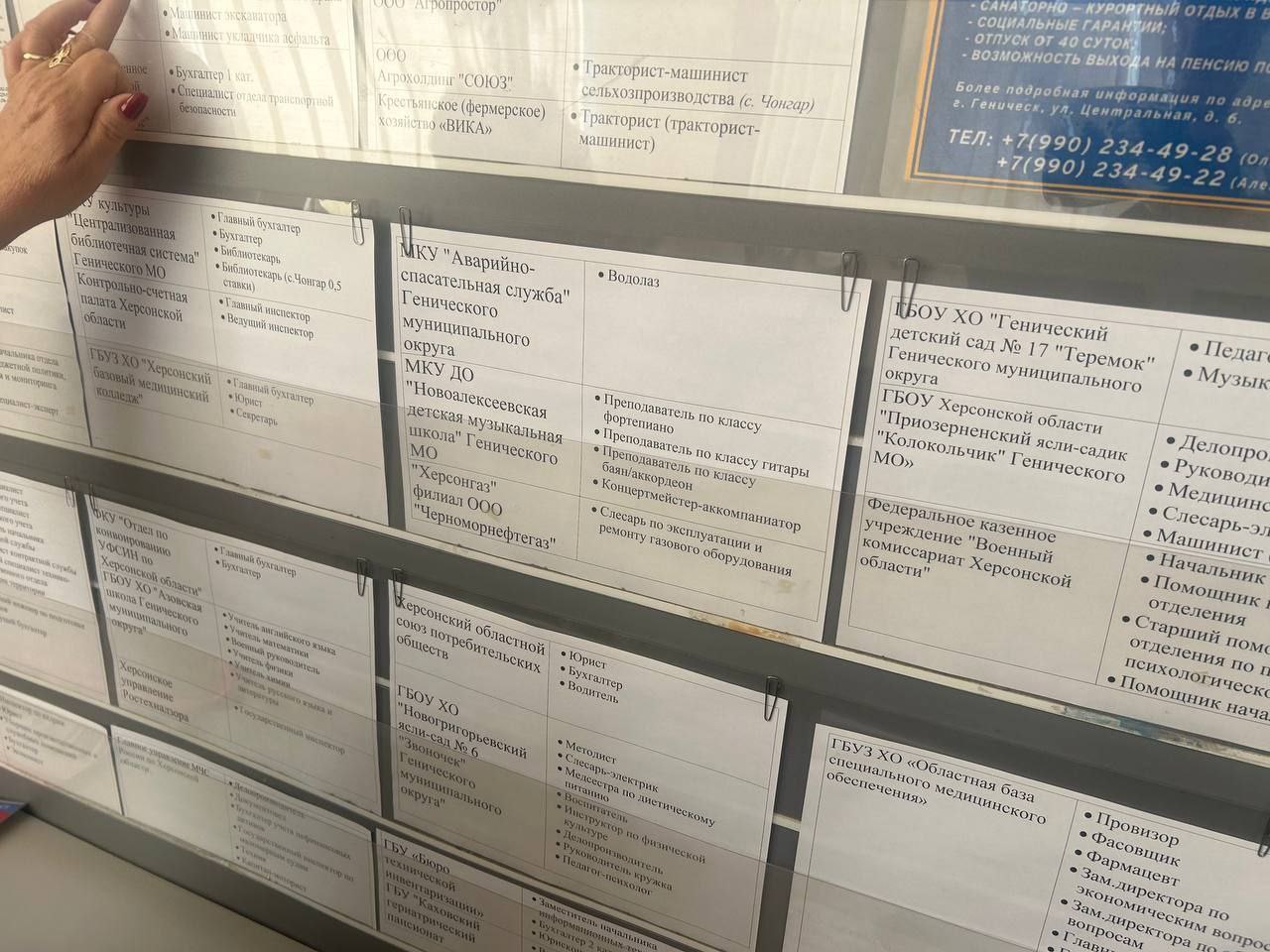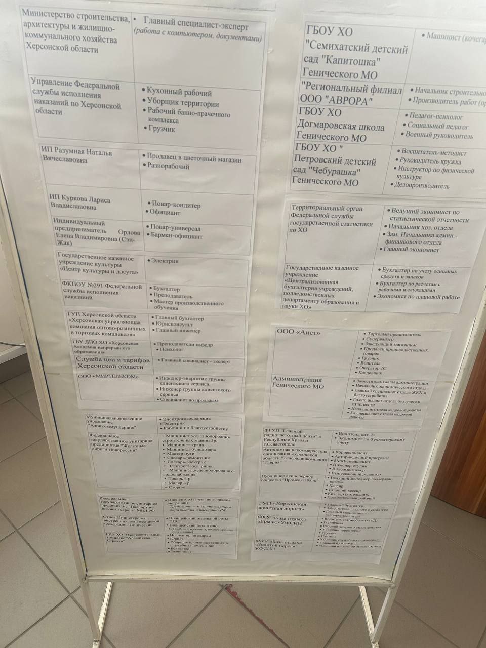 Побувавши в окупаційному центрі зайнятості Генічеського «муніципального округу», зрадник заявив у своєму телеграмі: «Бери і працюй! Лише тут більше 900 вакансій: від вантажників до начальників». Вакансії начальників на стенді, щоправда, не показав, але те, що окупанти шукають прибиральниць, кухарів, офіціантів, електриків, бухгалтерів, машиністів, слюсарів, викладачів, вихователів, водіїв, медсестер і навіть водолазів, видно.
