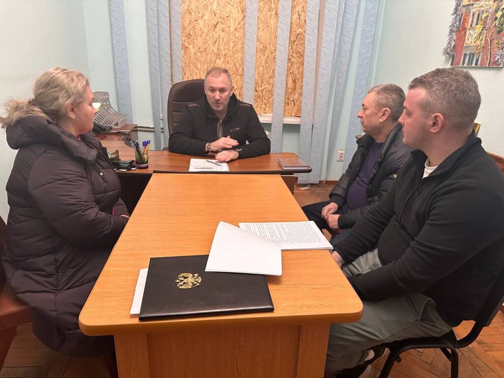 Віолетта Шляжко, російський “сенатор” Константін Басюк, Мар’ян Жолубак і Максим Новак у Новій Каховці, січень 2024 року. Фото з окупаційних пабліків