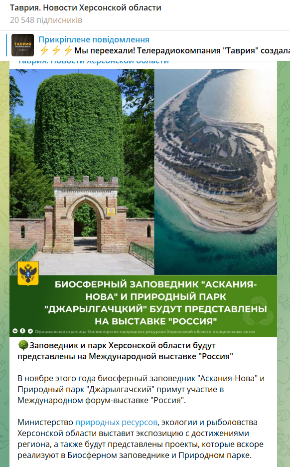У листопаді цього року захоплені російськими окупантами біосферний заповідник «Асканія-Нова» та Національний природний парк «Джарилгацький» візьмуть участь у міжнародному форум-виставці «Росія».Про це повідомляють херсонські пабліки, підконтрольні російським окупантам. Повідомляється, що окупаційне міністерство природних ресурсів, екології та рибальства Херсонської області виставить експозицію з досягненнями регіону.В також будуть представлені проекти, які незабаром реалізують у біосферному заповіднику та природному парку, - йдеться в повідомленні.