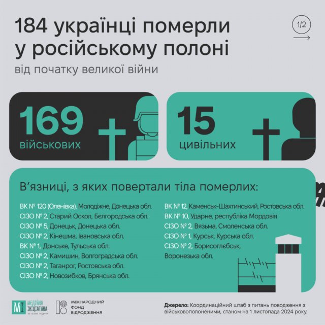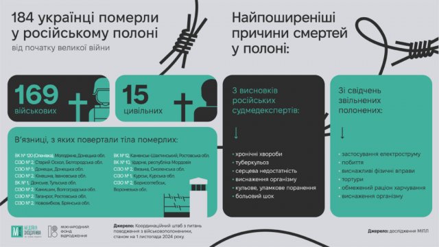 З 24 лютого 2022 по кінець жовтня 2024 року в Україну повернули 184 тіла загиблих у полоні українців. Серед них 169 військових і 15 цивільних. Правозахисники вважають, що кількість загиблих полонених значно більша.Про це повідомляє Медійна ініціативі за права людини (МІПЛ) з посиланням на інформацію Координаційного штабу з питань поводження з військовополоненими.
