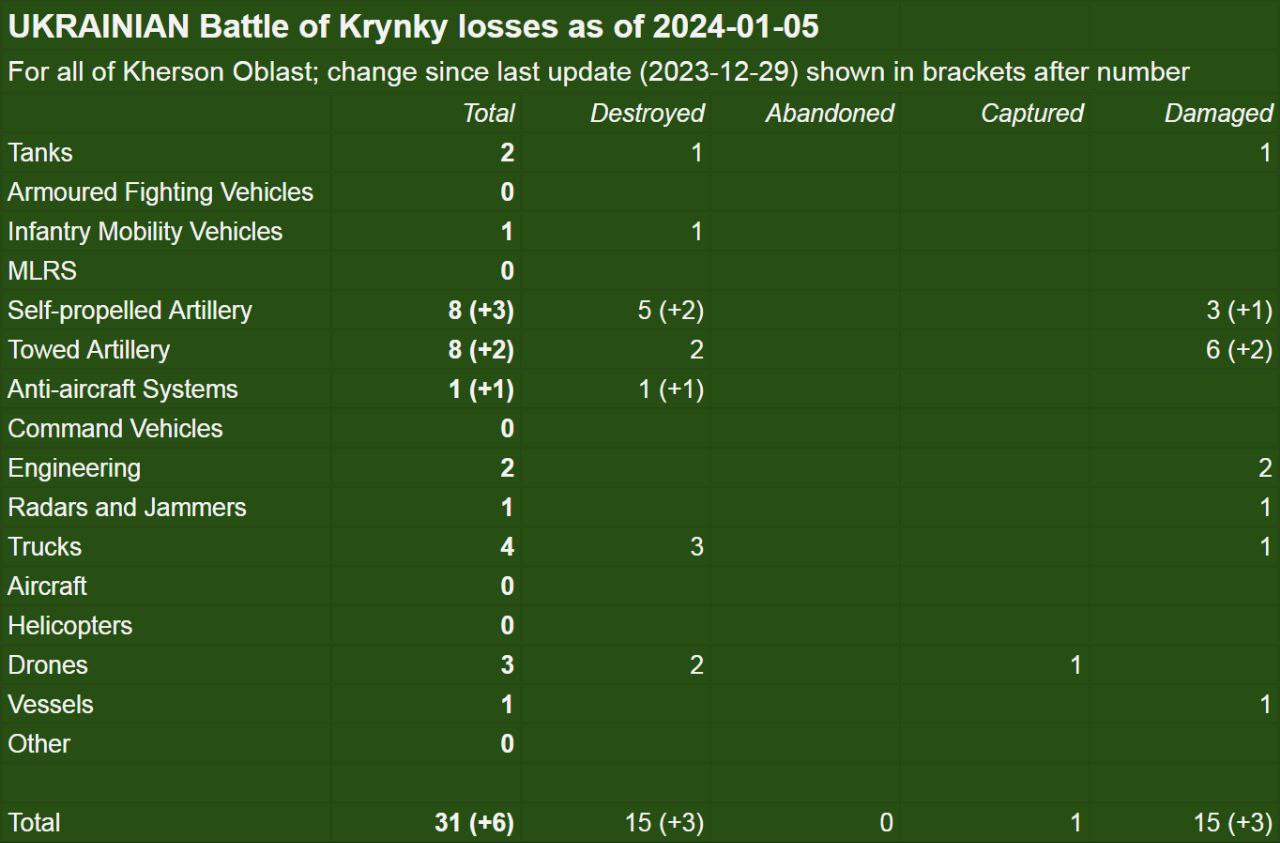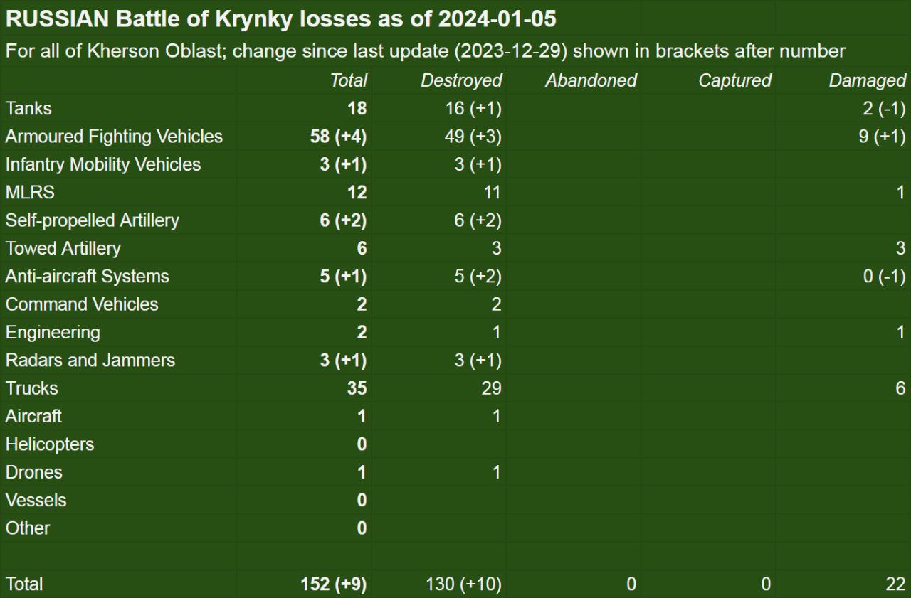 OSINT-аналітики зробили підрахунок втрат техніки в боях навколо Кринків, які підтверджуються оприлюдненими в соцмережах та інших відкритих джерелах фото чи відео. Аналітики порахували втрати ЗСУ та російських окупантів. Останні втратили 152 одиниці техніки. Найбільше - бойових броньованих машин - 58 одиниць. Серед втрат рашистів 35 вантажних авто, 18 танків, 12 реактивних систем залпового вогню, 12 одиниць ствольної та самохідної артилерії, 5 зенітних систем, також дві командні машини та дві інженерні машини.