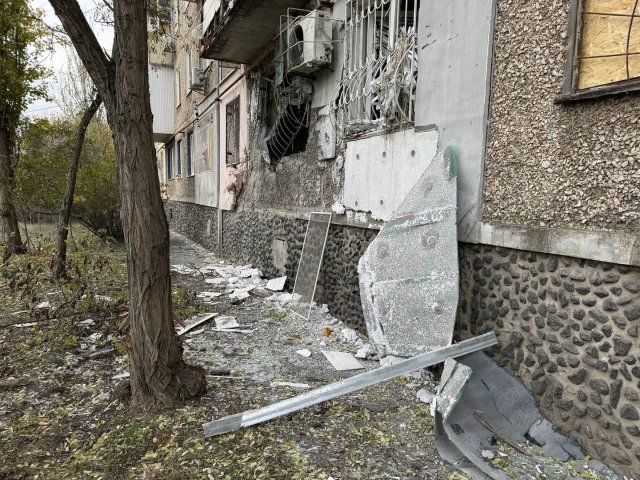 Російські військові вночі 20 листопада обстріляли Корабельний район Херсона. Один зі снарядів влучив у квартиру в багатоповерхівці. Власників оселі не було вдома. Зранку комунальники та місцеві жителі ліквідовували наслідки атаки.Оксана Кобець говорить, обстріл розпочався близько першої години ночі. Жінка нарахувала три влучання."Повилітали шибки, уламки залетіли до людей у квартири.