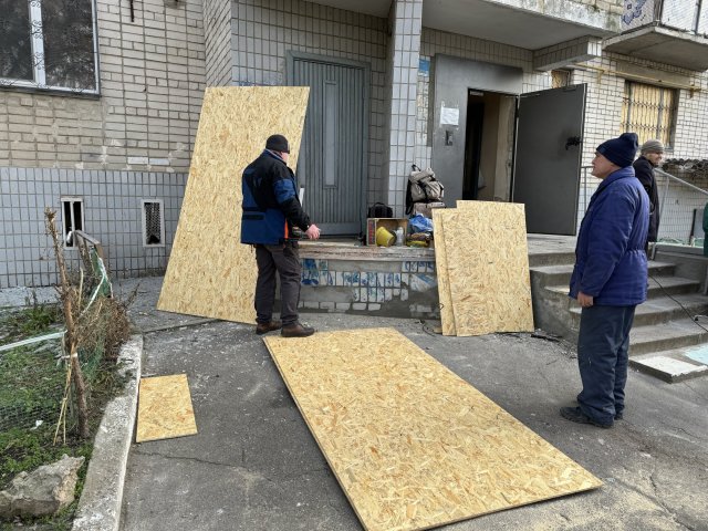 "Пошкоджені близько 40 вікон. Працюємо однією бригадою у кількості шести людей. Тут тільки вікна зашили та балкони. Дах не зачепило. Люди не постраждали", говорить бригадир ХОКАРС Олег Козаченко.