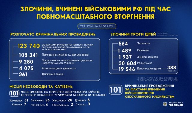 В Україні з 24 лютого 2022 року, початку повномасштабного вторгнення РФ, було поранено загалом 1489 дітей.Про це у Фейсбуці поінформувала пресслужба Нацполіції України, передає Укрінформ."Станом на 01.08.2024 в Україні (і з початку повномасштабної війни були - ред.) поранені 1489 дітей, зниклими безвісти вважаються 1937 дітей, розшуканими - 30 604 дітей", - зазначили у НПУ.