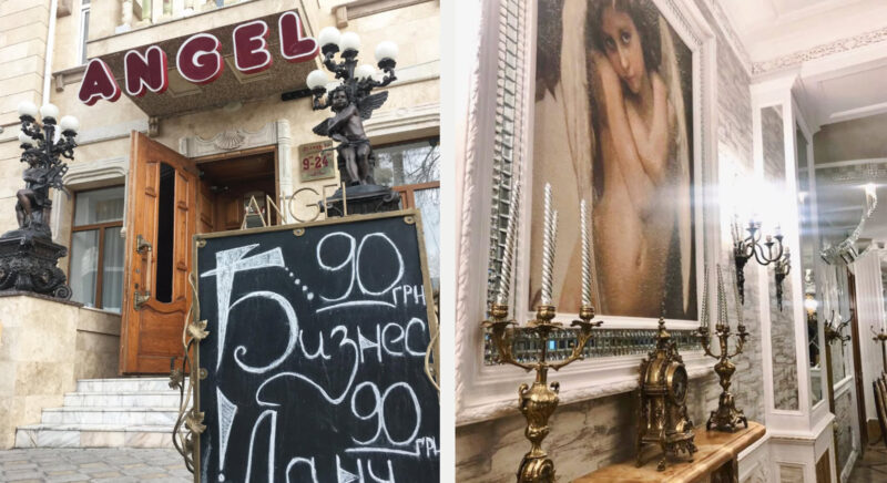 В Херсоні ресторан “Angel”знаходився за адресою Пилипа Орлика 18. Фото з соцмереж закладу дають зрозуміти, що його власник був начісто позбавлений всілякого смаку. Інтер’єр закладу складався з усіляких позолочених бюстів , статуй в людський зріст та репродукцій класичних картин. Все те, що росіяни, яких так полюбляє Лєщенко, називають терміном “дорого-багато”.