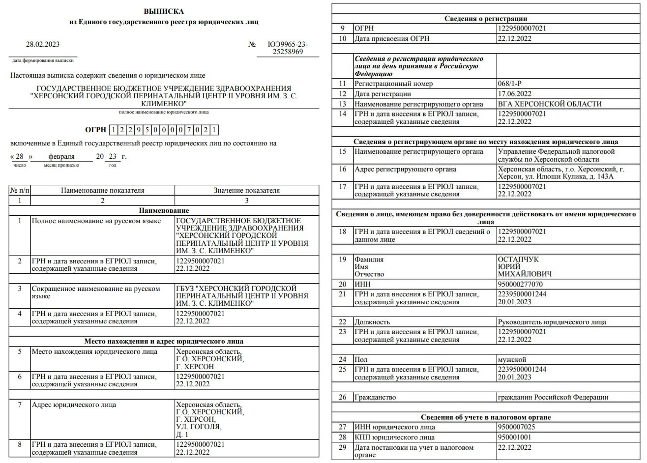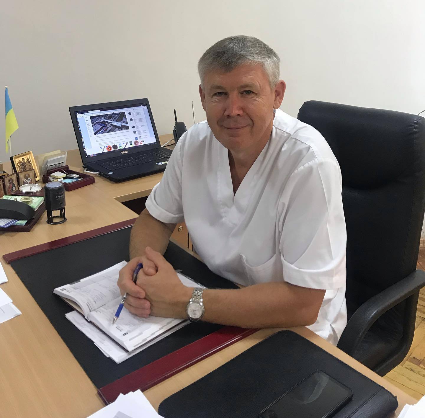 На фото:Юрій Остапчук та документи стосовно переоформлення лікарні, яку він очолював, за російським законодавством. Фото: «База зрадників Херсона»