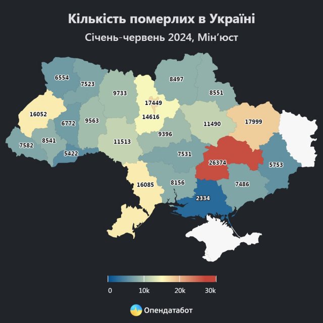 Знову ж таки найменше померлих цього року – на Херсонщині: 2334 людини. Причині – ті ж самі, адже йдеться лише про майже 28% деокупованої частини області.