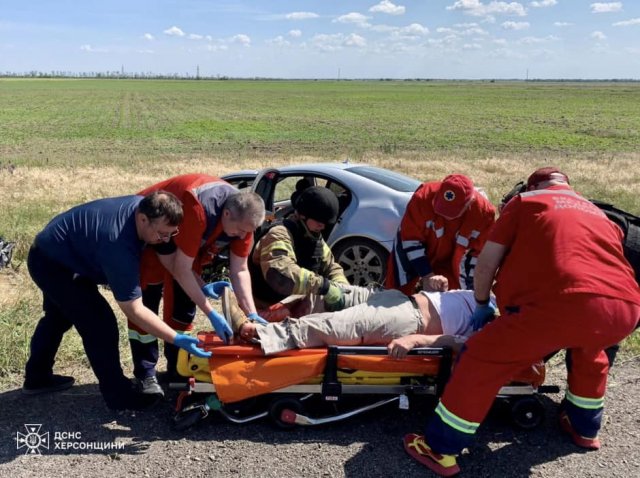 Сьогодні вдень на номер 101 м.Херсон надійшло повідомлення про те, що за межами с.Посад-Покровське сталась дорожньо-транспортна пригода. Зіткнулись два легкових автомобілі Mercedes та Мitsubishi.Про це повідомляє Головне Управління ДСНС України у Херсонській області.Херсонські рятувальники надали допомогу водію, що постраждав при ДТП. Водія одного з автомобілів затиснуло понівеченими конструкціями автівки.