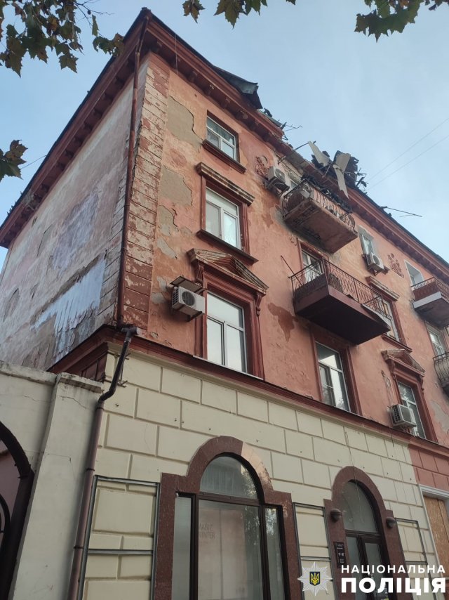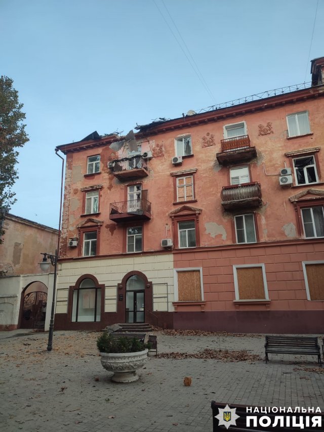Через нічний обстріл центру Херсона постраждав багатоквартирний будинок, у якому значно пошкоджено дах, балкони, комунікації у квартирах та вибито вікна на верхніх поверхах.