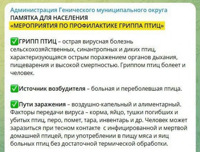 3До фекального забруднення Азовського моря додався спалах пташиного грипу. Колаборанти тимчасово окупованої Херсонщини заметушилися через поширення інфекції.Про це пише Телеграм-канал РІА-Мелітополь.Окупаційні “адміністрації” захоплених районів регіону випустили пам’ятки з профілактики та боротьби з пташиним грипом.У руках окупантів та колаборантів території перетворюються на непридатне для життя місце.sprotyv.info