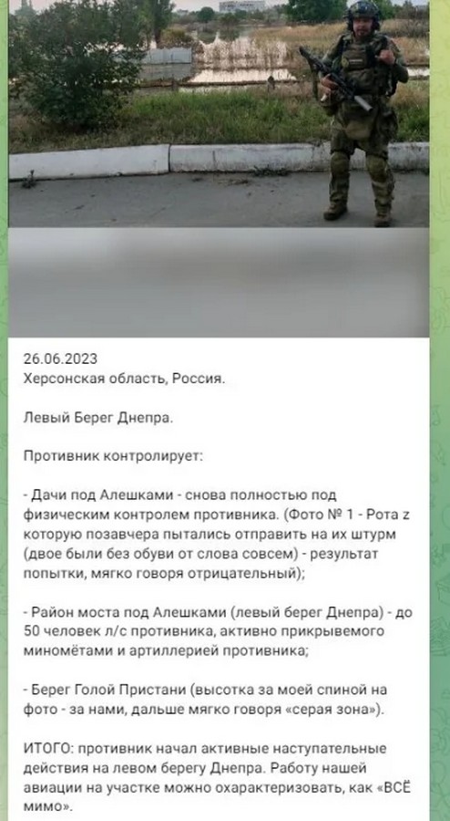 Не маючи достатніх сил для стримування ЗСУ на лівому березі Дніпра у Херсонській області, кремлівський режим відправляє на штурм плацдарму ЗСУ в районі Антонівського мосту колишніх в’язнів з підрозділів«шторм z».При цьому постачання у ЗС РФ на даній ділянці наразі на такому рівні, що в декого з окупантів не виявилося навіть взуття, про що свідчить фото, оприлюднене в деяких прокремлівських Telegram-каналах.Фото: Скриншот/t.me/romanov_92«Дачі під Олешками — знову під фізичним контролем супротивника.